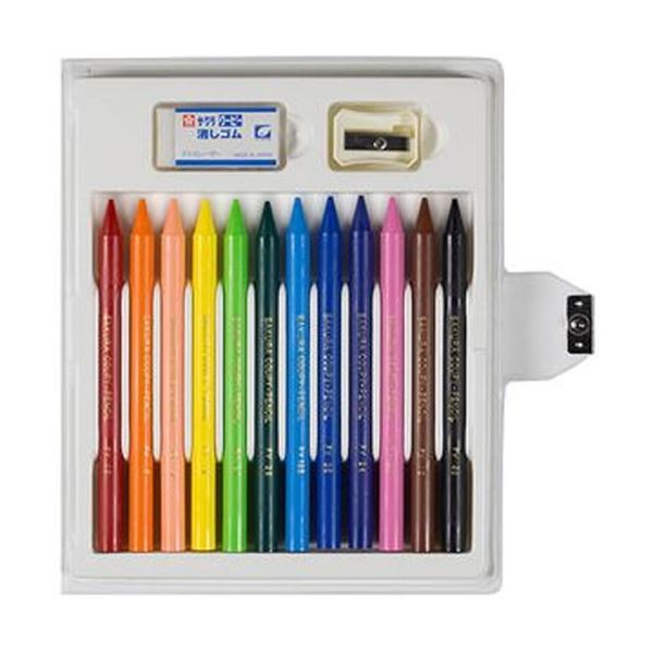 セット内容:クーピー:きいろ・むらさき・だいだいいろ・みずいろ・うすだいだい・きみどり・ちゃいろ・みどり・あか・あお・ももいろ・くろ、削り器、消しゴム