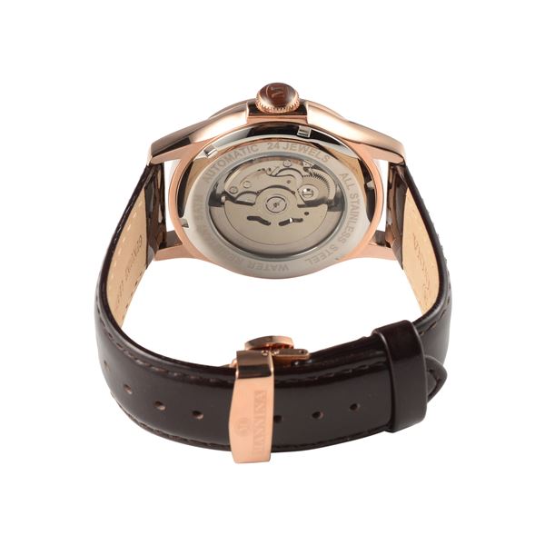 文字盤にも、デザインの中に革を取り入れており、裏蓋からムーブメントが見えるスケルトンモデルを採用、機械式の時計。ブックタイプボックス付き、交換が出来るベルト1本付き(工具も同梱)になります。