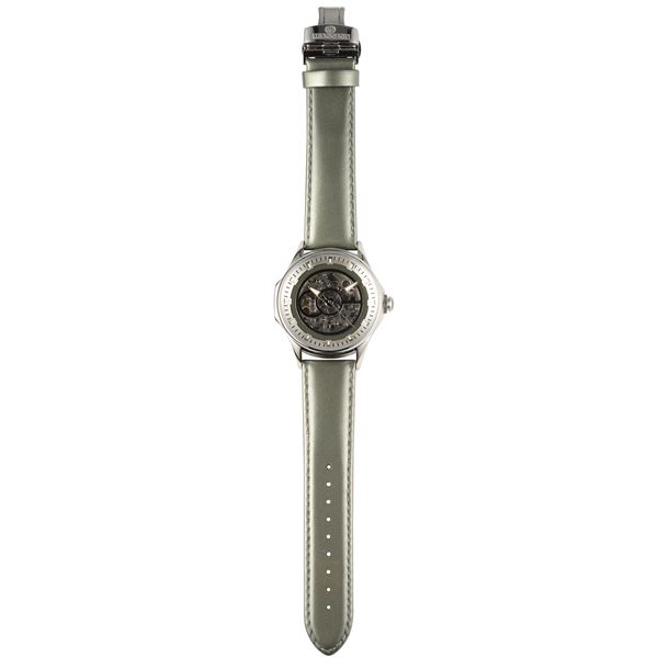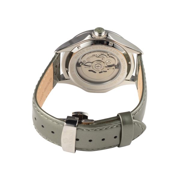 文字盤にも、デザインの中に革を取り入れており、裏蓋からムーブメントが見えるスケルトンモデルを採用、機械式の時計です。ブックタイプボックス付き、交換が出来るベルト1本付き(工具も同梱)になります。