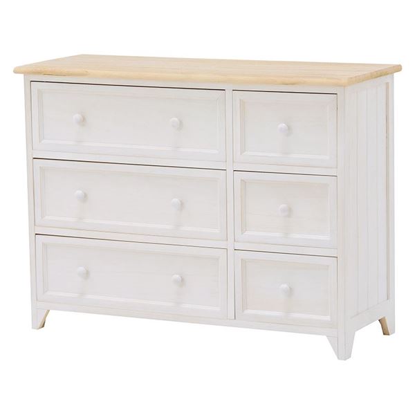 シャビーホワイトの本体にアンティーク調ナチュラルな天板が映える、シンプルローチェスト。