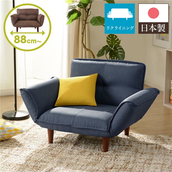 日本製 国産 リクライニングソファー/ローソファ 低い フロアタイプ ロータイプ フロアソファ ー 【1人掛け タスク生地 ネイビー】 脚部:ブラウン 幅88cm 肘付き 脚付き 茶 送料無料