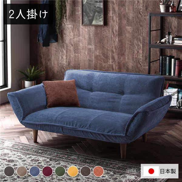 商品仕様: リクライニングソファ 2人掛 コーデュロイ生地 ブルー 青 脚部 ナチュラル 日本製 ローソファ