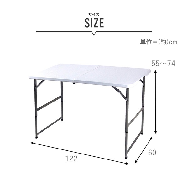 商品仕様: 作業テーブル アウトドアテーブル 約幅60×長さ122×高さ48.5〜74cm 折りたたみ 強化プラスチック天板 スチール キャンプ