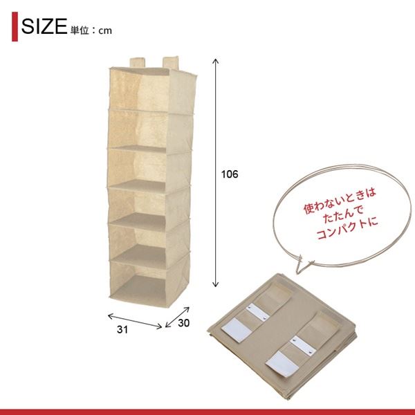 商品仕様: 衣類収納 6段 約幅31cm ベージュ パイプ 吊り下げタイプ 折りたたみ 吸湿性 通気性 軽量 不織布 ハンガーラック クローゼット