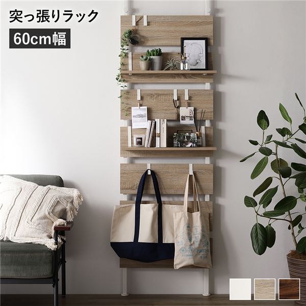 壁面 突っ張り ウォールラック 幅60cm ナチュラル 棚板2枚 フック7個付き 壁面整理 収納 賃貸OK 玄関 リビング ダイニング 送料無料