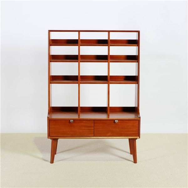 赤みを帯びた美しい色合いと、長い脚が特徴のリビングシェルフ。