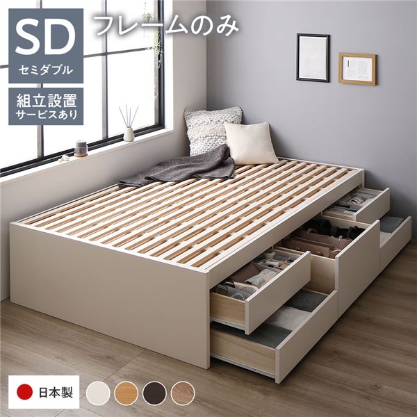 セミダブルベッド 白 ホワイト 単品 〔組立設置サービス付き〕 収納 ベッド ヘッドレス 通常丈 フレームのみ 白 ホワイト 収納付き すのこ 日本製 国産 送料無料
