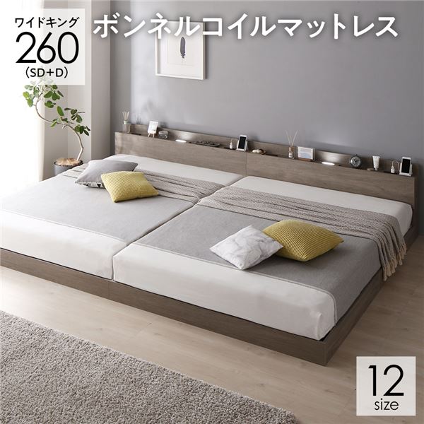商品仕様: ベッド ワイドキングサイズベッド キングベッド 260 SD+D ボンネルコイルマットレス付 グレー 灰色ジュ 宮付 連結ベッド すのこベッド