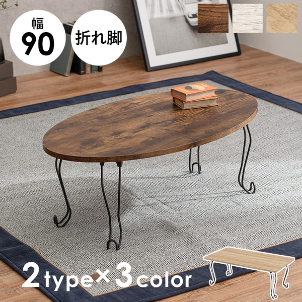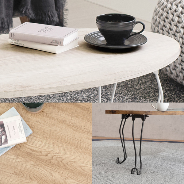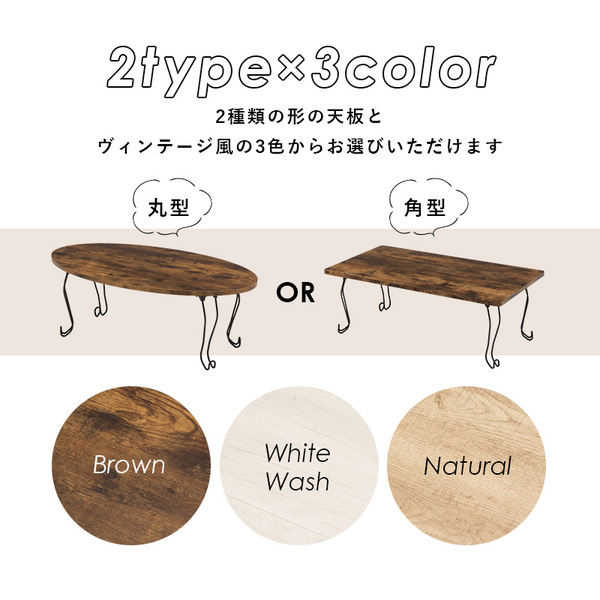 古木風の木目を再現した天板にアイアンの猫脚を合わせた、シックな可愛さのあるデザイン。折りたたみ式なのでコンパクトに収納可能。
