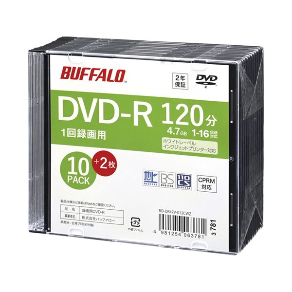 バッファロー 光学メディア DVD-R 録画用 120分 法人チャネル向け 10枚+2枚 RO-DR47V-012CWZ 高画質録画に最適 ビジネス向け光学メディア 120分収録可能 10枚+2枚セット