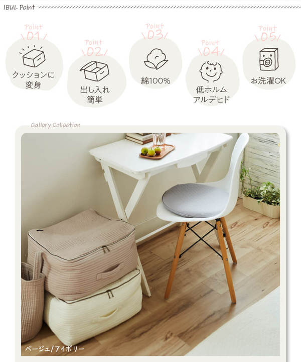 イブルの新商品!マルチケース。おふとんや衣類などたくさんつめこんでクッションみたいに使えてインテリアに置いてもおしゃれな収納袋。3カラー展開