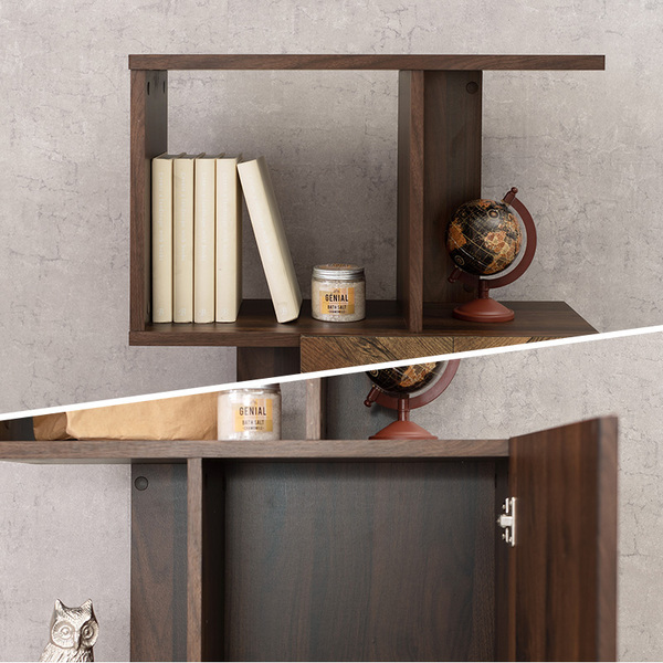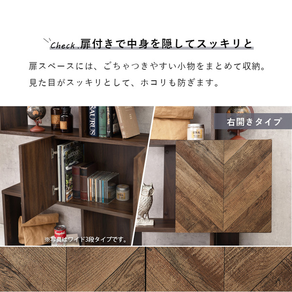 扉の木目調のシートがアクセントになり、収納の幅も広がるディスプレイラック