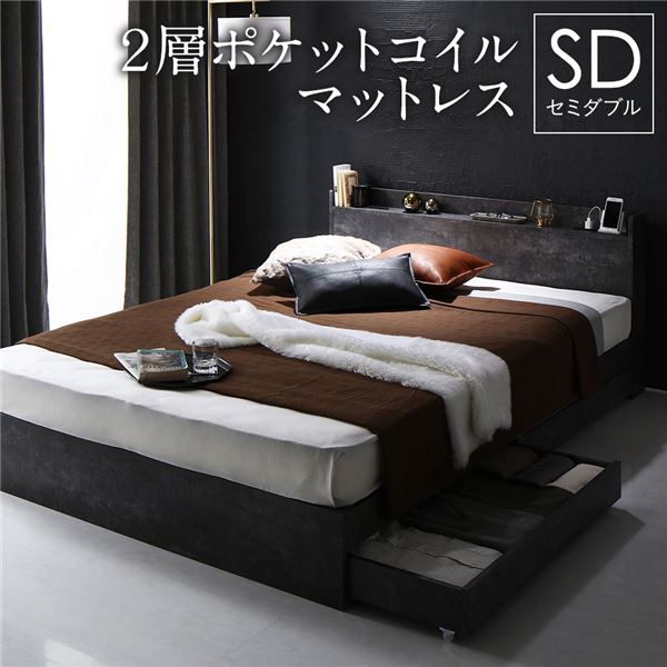 セミダブルベッド グレー 灰色 ベッド 2層ポケットコイルマットレス付 ストーングレー 灰色 収納付き 宮付き コンセント付きで時計やフォトフレームの電源、携帯の充電に最適。 枕元のヘッドボードが時計や携帯、写真、フォトフレームなどの小物置き場に最適。電気スタンドやその他照明器具を置くご予定の場合はサイズの確認、及びコンセント付きである事をお確かめ下さい。 衣服やシーツカバーなどの整理、収納に便利な引出し。 1人でゆったり余裕の広さが嬉しい。 モダンでシンプルなデザインのセミダブルベッド ストーングレーのストーン調で、整理 収納付き で宮付き (置き台 ヘッドボード 棚付き) 、棚付き (置き台 置き場付き) 、コンセント付き 2層ポケットコイルマットレスもセット 快適な眠りとスタイリッシュなインテリアを叶える、機能満載のベッド