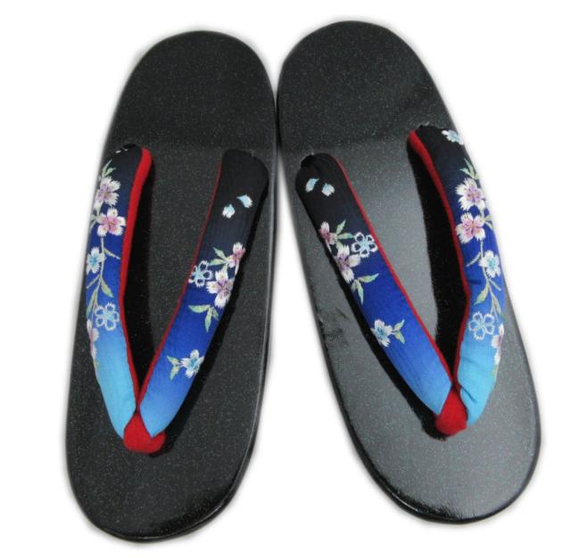 【訳有り 少難あり】 下駄 本桐 女性用 フリー 24cm ラメ黒台 黒青水色ぼかし地撫子刺繍鼻緒 H・L 浴衣 ゆかた げた ゲタ レディース