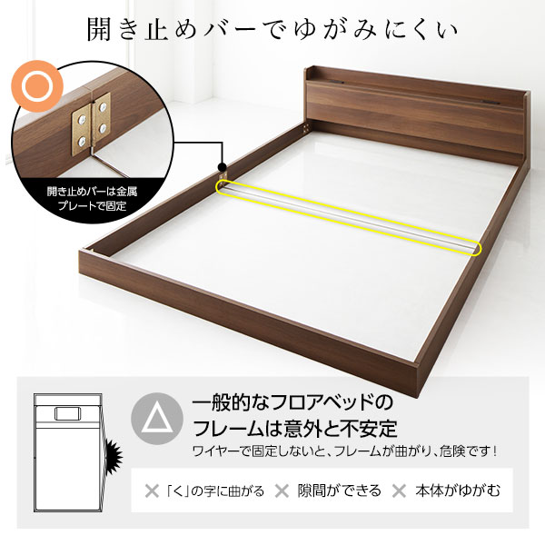 シングルベッド 黒 ブラック ベッド 国産 日本製 国産ポケットコイルマットレス付 レギュラー 黒 ブラック 低床 宮付 コンセント すのこ ローベッド ローベッドだから圧迫感がなくお部屋が広々。 コンセント付きで時計やフォトフレームの電源、携帯の充電に最適。 枕元のヘッドボードが時計や携帯、写真、フォトフレームなどの小物置き場に最適。電気スタンドやその他照明器具を置くご予定の場合はサイズの確認、及びコンセント付きである事をお確かめ下さい。 湿度の高い夏場、風通しが良く通気性に優れ除湿効果の高いすのこタイプです。蒸れにくい構造で乾燥を促します。 一人暮らし、狭いお部屋に最適。省スペースでお部屋の空間を有効活用しましょう。搬入経路が心配なお部屋にもお勧め。 シンプルでモダンなデザインの低床フロアベッド シングルサイズの国産 日本製 ポケットコイルマットレス付き セット で、快適な寝心地を提供 ブラックカラーで、棚や宮、コンセントも備えたローベッド 低い ロータイプ フロアベッド フロアタイプ 贅沢な眠りをお約束
