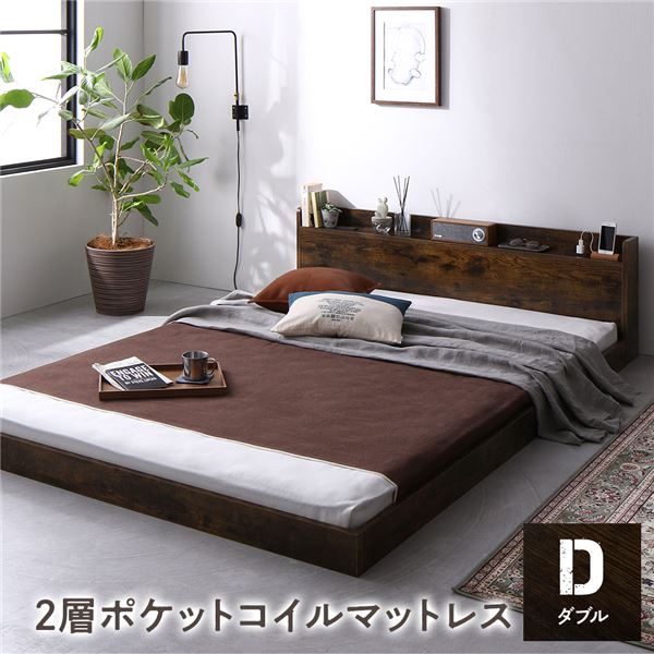 ダブルベッド ベッド 2層ポケットコイルマットレス付き ヴィンテージブラウン 低床 棚付き 宮付き コンセント付き すのこ ローベッド お客様組立品