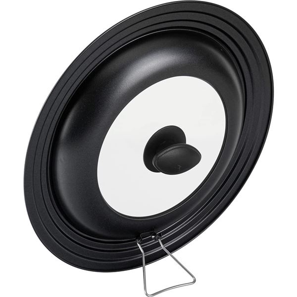 スタンド付きで立てて置ける、窓付フライパンカバー。強化ガラス製の窓付で、調理の様子が確認可能。