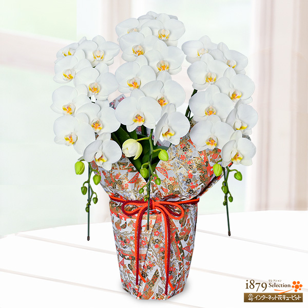 全国花き品評会で金賞受賞歴のあるモテギ洋蘭園から、白い花びらが美しいおすすめの胡蝶蘭です。花の上品さをさらに引き立てる、母の日限定の千代紙ラッピング仕様でお届けいたします。【※植物の花つき、花の色、枝ぶりなどは写真と若干異なることがありますのでご了承ください。】【※この商品は、離島などの一部の地域へのお届けはできません。】
