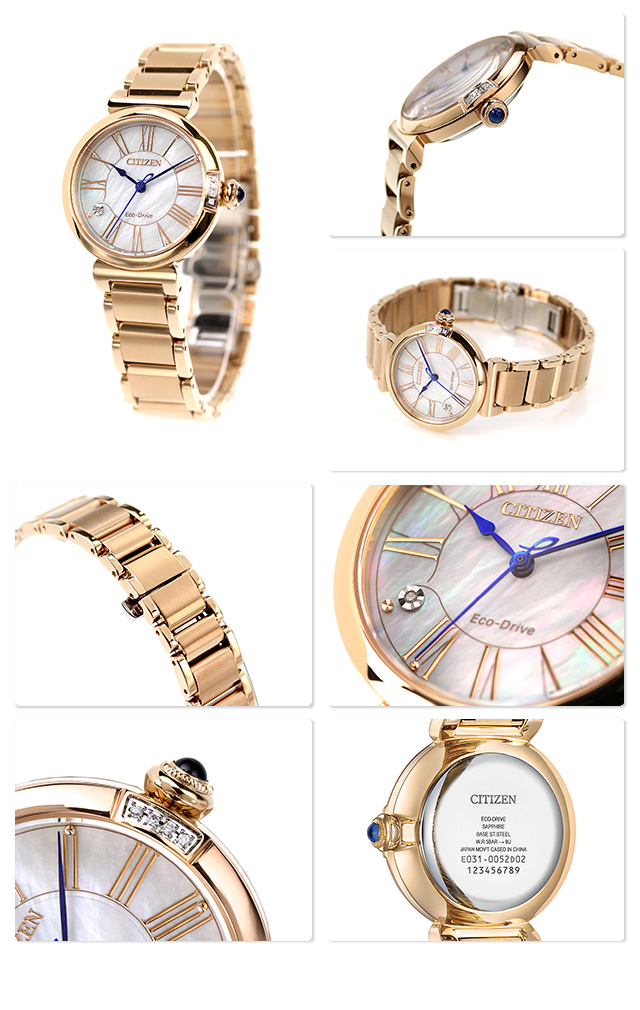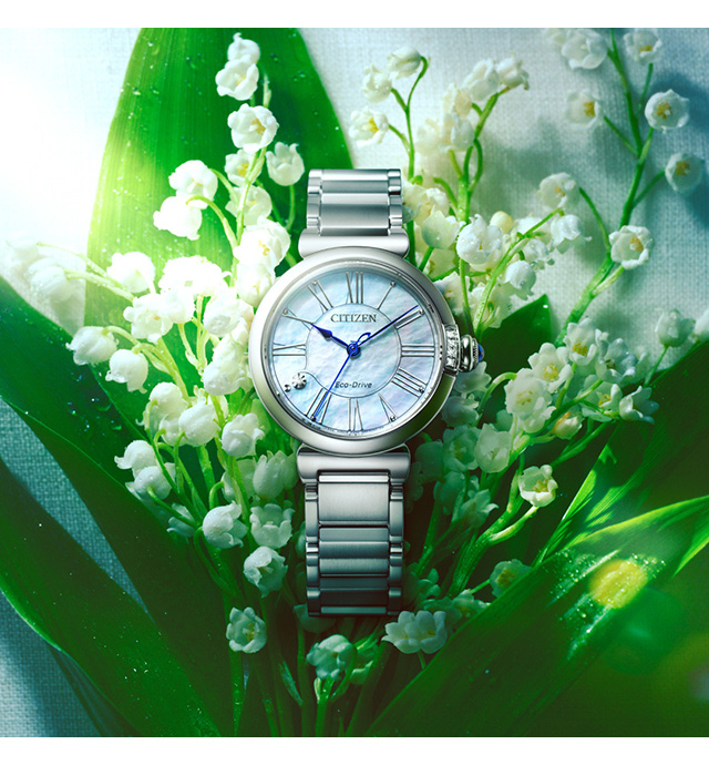 正規品 7年保証キャンペーン 送料無料 シチズン エル エコ・ドライブ スズラン 香水 ソーラー エコドライブ レディース 腕時計 EM1063-89D CITIZEN L ROUND Collection Eco-Drive アナログ シェル ゴールド ◆地球のように美しいサステナブルウオッチ、CITIZENL(シチズンエル)。幸せを呼ぶスズランをモチーフにした上品なたたずまいで、きらめくダイヤモンドのアクセントが、華やいだジュエリーのような印象を与えます。スズランを思わせる柔らかな曲線のフォルムと白蝶貝の文字板でみずみずしく、清楚で凛とした上品さを演出します。8時の位置で輝く1ポイントのダイヤモンドは雨あがりのスズランに輝く花雫を表現。ケースは厚みを感じさせず、腕に馴染みやすいすっきりとしたデザインを採用。香水瓶をイメージして3時の位置にあしらった4ポイントのダイヤモンドとりゅうずを彩るブルーのアクセントが、腕元を見るたびに、可憐なスズランの花を手にした時の幸せな気持ちを呼び起こしてくれるモデルです。 発売日:2023年04月発売