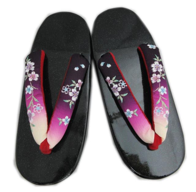 【訳有り 少難あり】 下駄 本桐 女性用 フリー 24cm ラメ黒台 濃紫クリームぼかし地撫子刺繍鼻緒 H・L 浴衣 ゆかた げた ゲタ レディース