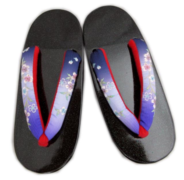 【訳有り 少難あり】 下駄 本桐 女性用 フリー 24cm ラメ黒台 紺青紫ぼかし地撫子刺繍鼻緒 H・L 浴衣 ゆかた げた ゲタ レディース