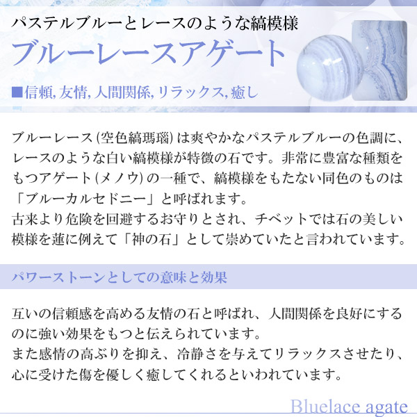 ブルーレース(空色縞瑪瑙)は互いの信頼感を高める友情の石と呼ばれ、人間関係を良好にするのに強い効果をもつと伝えられています。