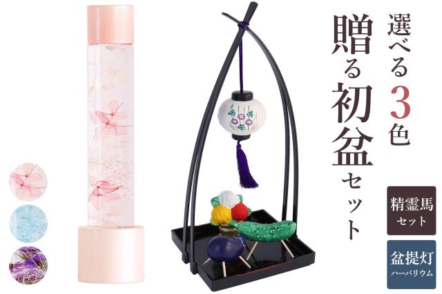大切な方へのギフト・贈り物としておすすめ!!3色から選べるハーバリウム盆提灯と陶器製の小さな盆提灯・精霊馬・精霊牛のセットを合わせた、当店オリジナルの初盆セットです。