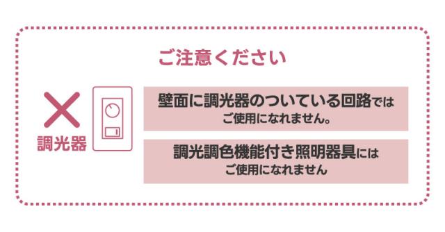 | 注意 | ※壁際スイッチに調光器のついている回路・調光調色機能付き照明器具にはご使用いただけません。 ※防水仕様ではないため、屋外でのご使用はご遠慮ください。 ※物流の安全を保証するため、リモコンには電池は入っておりません。(電池別売) |