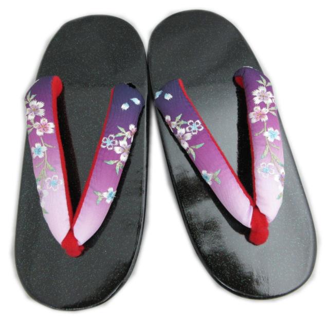 【訳有り 少難あり】 下駄 本桐 女性用 フリー 24cm ラメ黒台 濃紫薄紫ぼかし地撫子刺繍鼻緒 H・L 浴衣 ゆかた げた ゲタ レディース