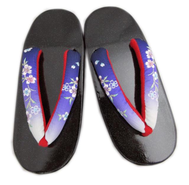 【訳有り 少難あり】 下駄 本桐 女性用 フリー 24cm ラメ黒台 青紫ぼかし地撫子刺繍鼻緒 H・L 浴衣 ゆかた げた ゲタ レディース