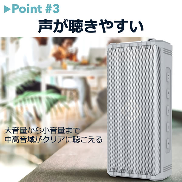 ・拡張機能:本体前面にマイク付き(マイク内蔵)で、スマートフォンの電話機能と連動してハンズフリー通話が可能です。PCやMacと接続すると、手元でスピーカー兼マイクとして利用可能。内臓のスピーカーやマイクより扱いやすく、オンラインミーティングにも活躍します。本体にマイクロSDカード(TFカード)のスロットやAUX端子を搭載しており、Bluetooth以外の入力による音楽再生も可能。ランダム再生とリピート再生も可能ですので、店舗等での継続再生目的としてもお使い頂けます。