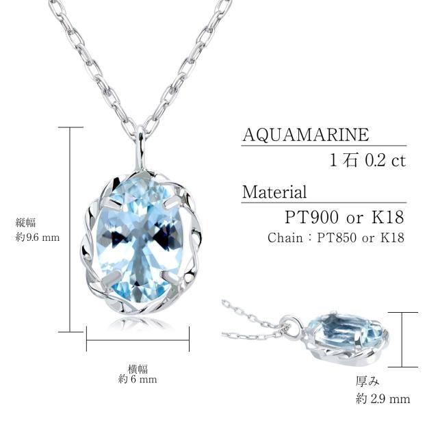 0.2ctのアクアマリンを、贅沢に地金を使用した飾りデザインで囲みました。デコルテにしっかりと光を集めて輝きを放ちます。