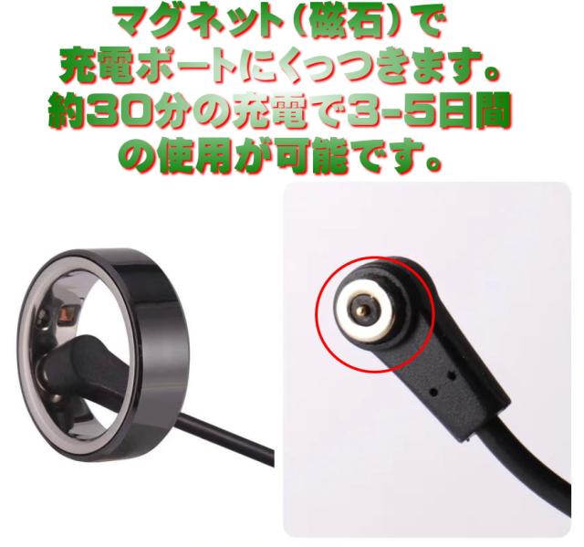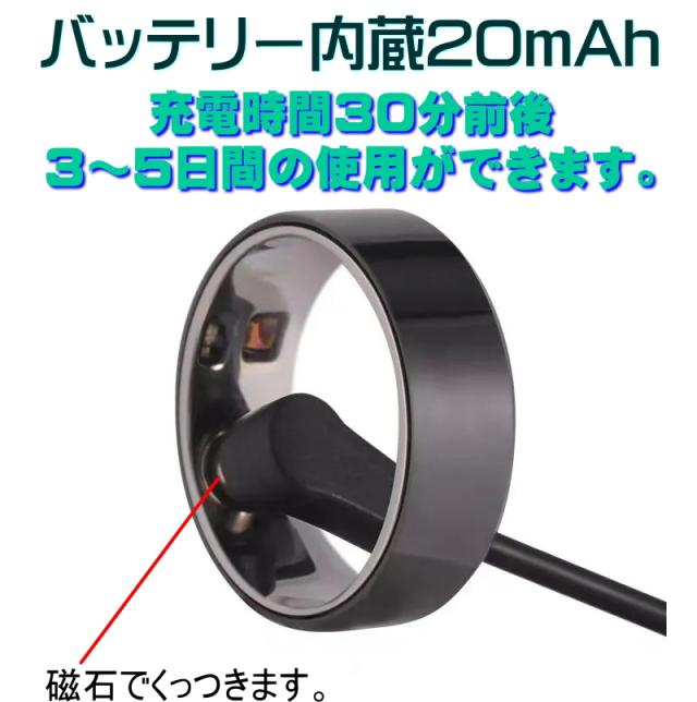 ◆スマートリング本体に電源ボタンなどはありません。充電後は3-5日後にはバッテリー残量は0になります。使用前に再度30分ほど充電を行ってください。通常使用で毎日はめる場合は、3日に1回程度30分の充電を行う事を推奨します◆