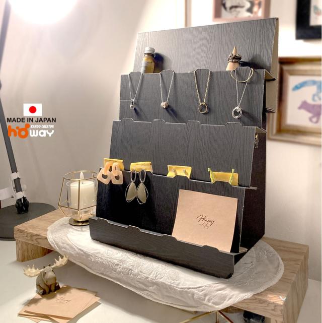 飾り棚 組み立て式 ディスプレイ ハンドメイド アクセサリー 什器 折りたたみ 傾斜 ポストカード 手作り 台 収納 ブラック パーツ ネックレス チャーム 手作り 設営 イベント コンパクト 紙製 ブラウン ホワイト アイボリー ピンク ブルー ハンドメイド飾り棚