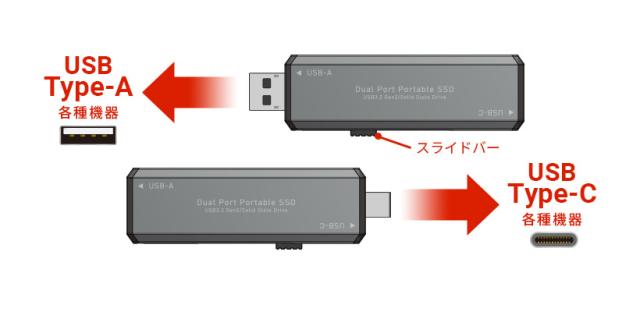 スライドバーでType-AとType-Cを切り替えて使うことができます。互換性を気にせずパソコンやタブレットなどで使えます。