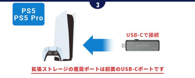 PS5の前面にあるType-Cポートに本製品を接続してPS5を起動します。拡張ストレージが認識され、PS4用のゲームがプレイできるようになっていれば移行完了です。