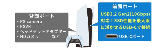背面のポートはPS camera、PSVR、ワイヤレスヘッドセットアダプター、HDカメラなどの接続ですべて埋まることもあるため、Type-Cポート接続の本製品だとSSDの性能を最大限に活かすことのできるUSB3.2 Gen2(10Gbps)接続で高速アクセスに加え、背面のポートも確保できるので便利です。