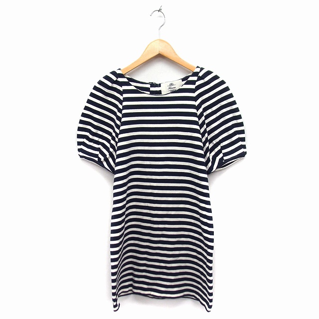 【中古】カオン Kaon ボーダー柄 ワンピース 袖タックバルーンスリーブ リボン 五分袖 ひざ丈 F ネイビー 紺 /FT21