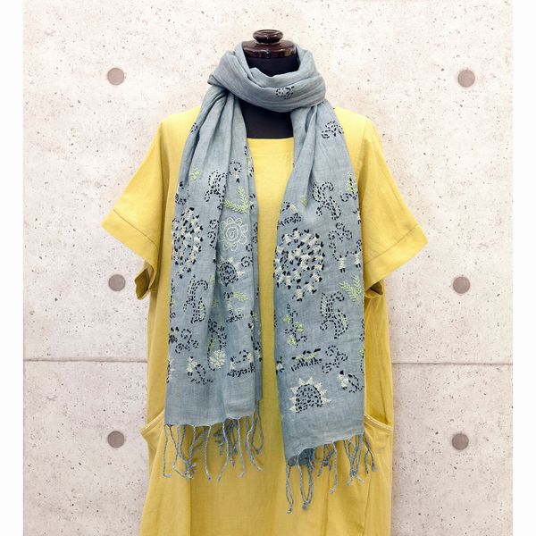 | 刺繍部分にたくさんの小さな人が集まってそれぞれの動きをしている、まるで物語の一部の様なストールです。 優しい色味が落ち着いた雰囲気を出します。 |
