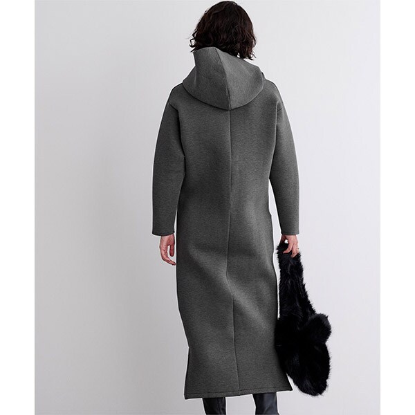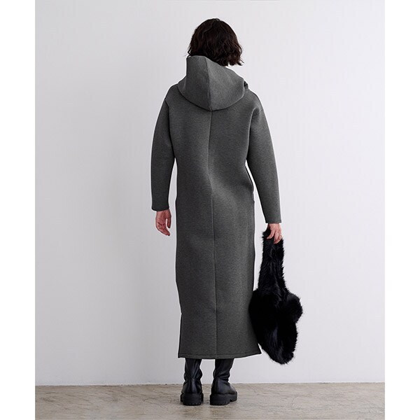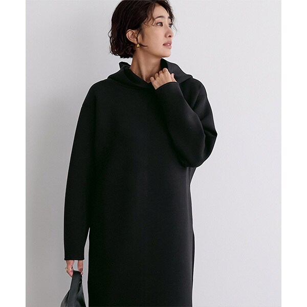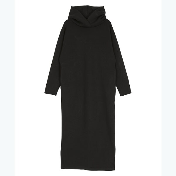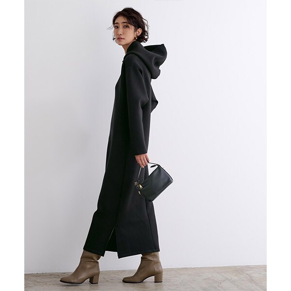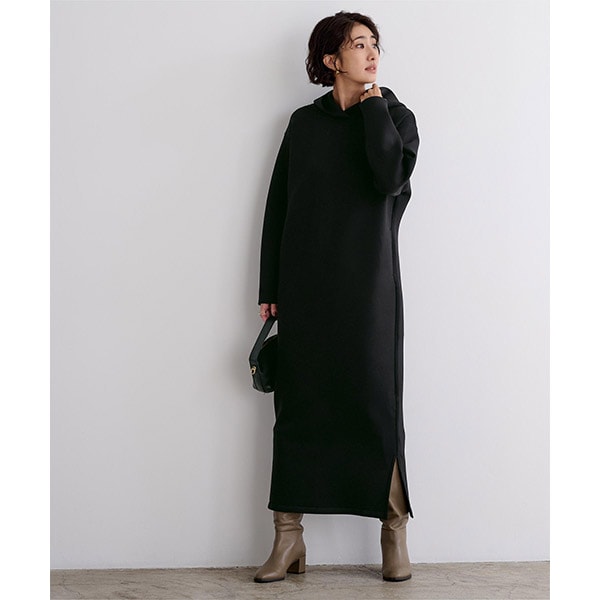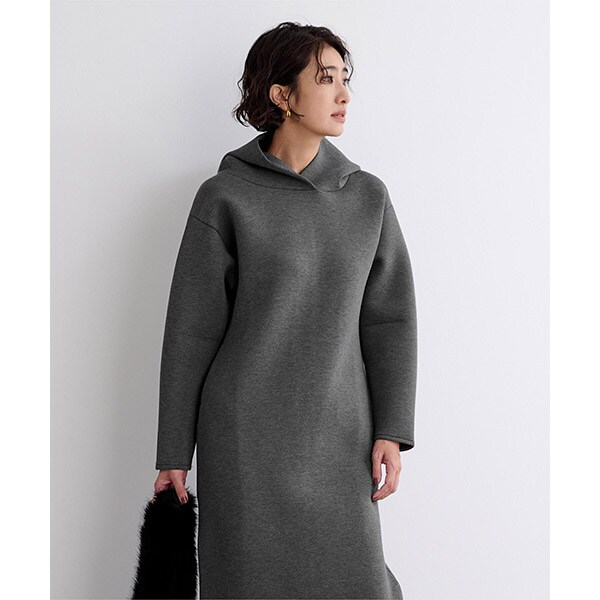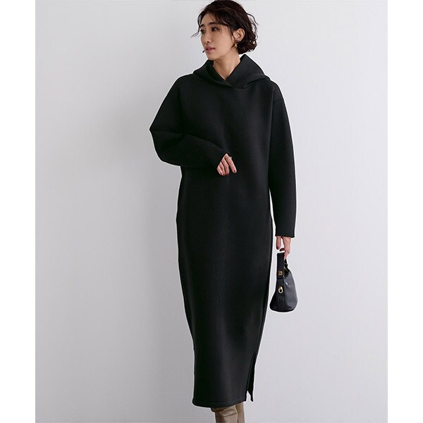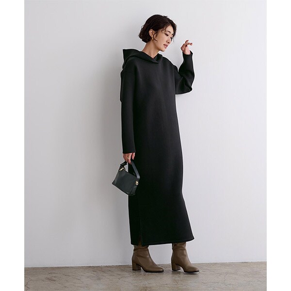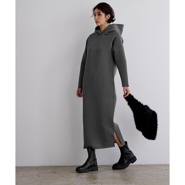 ロング丈且つ落ち着いたカラーバリエーションでカジュアルになり過ぎないフーディーワンピース。