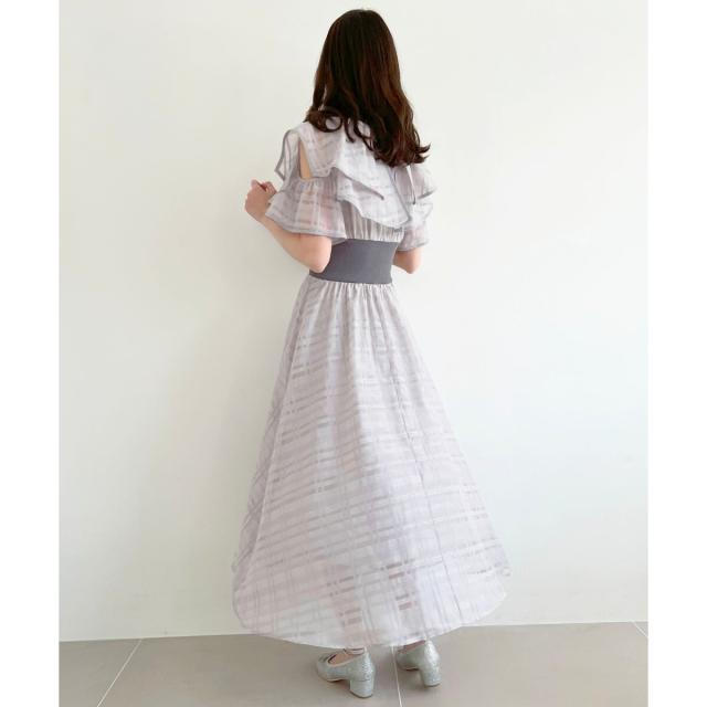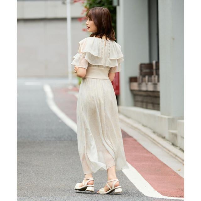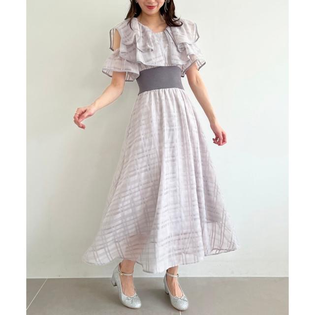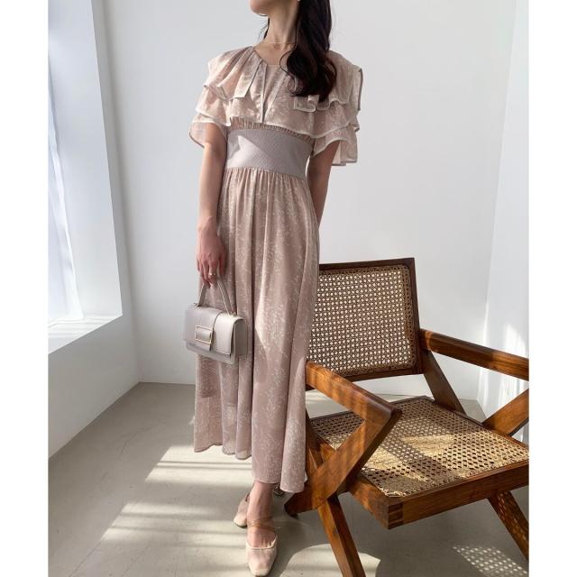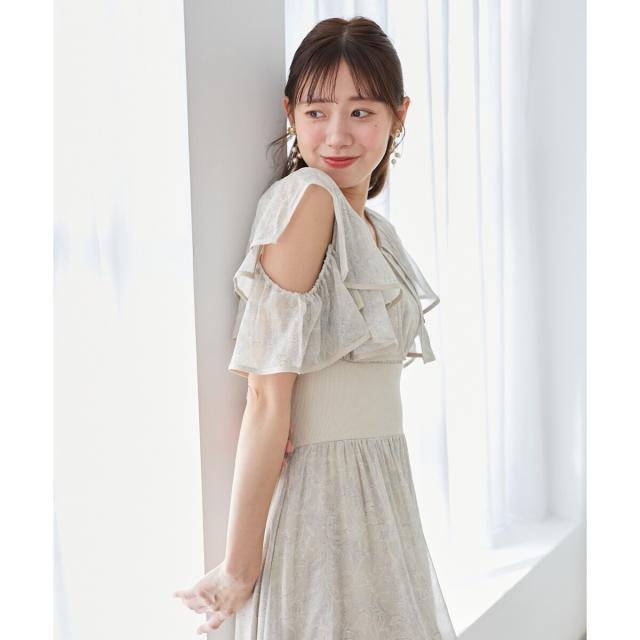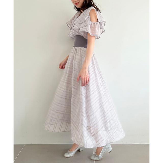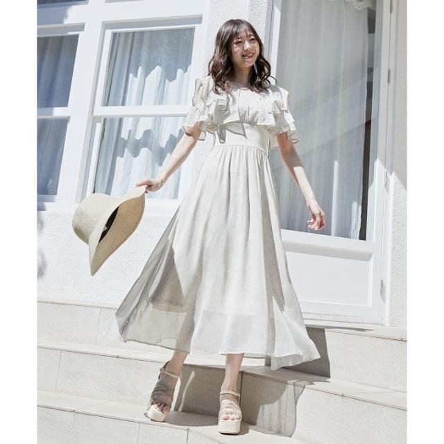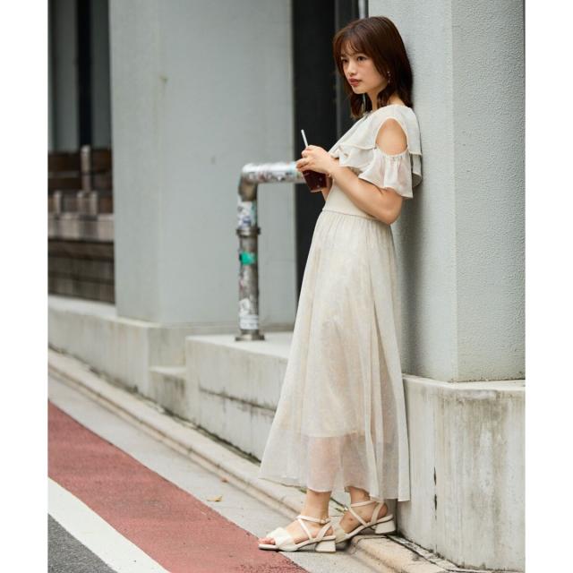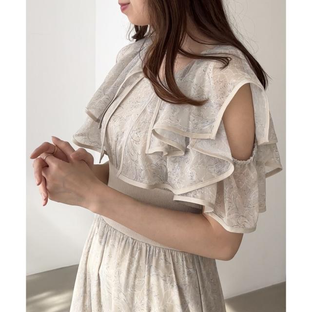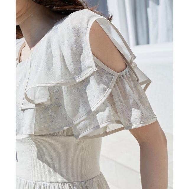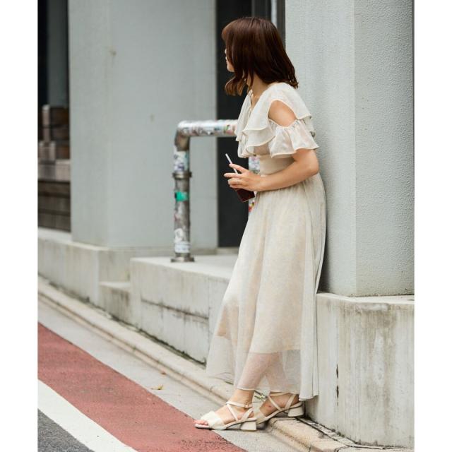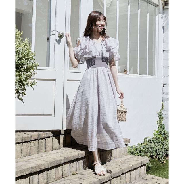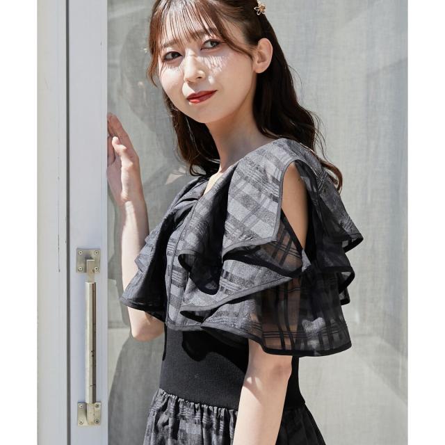 大きなフリルから覗くデコルテラインと肩の肌みせが大人あざとさを演出。