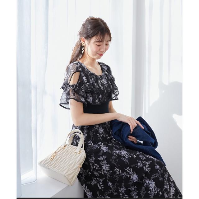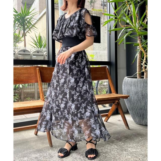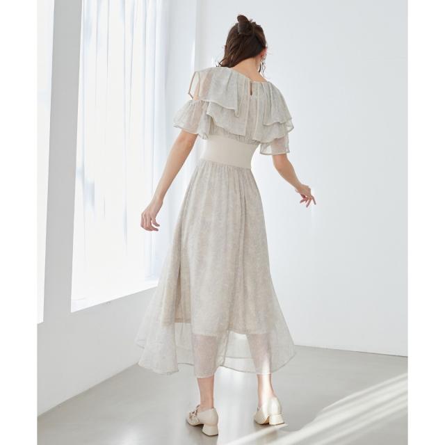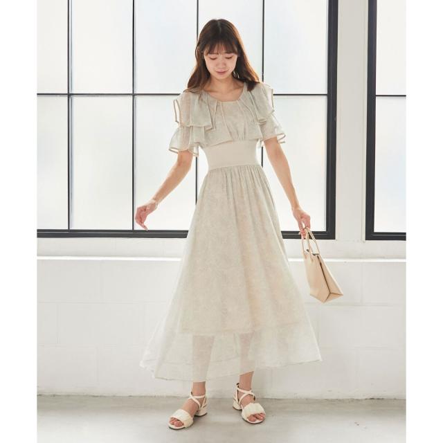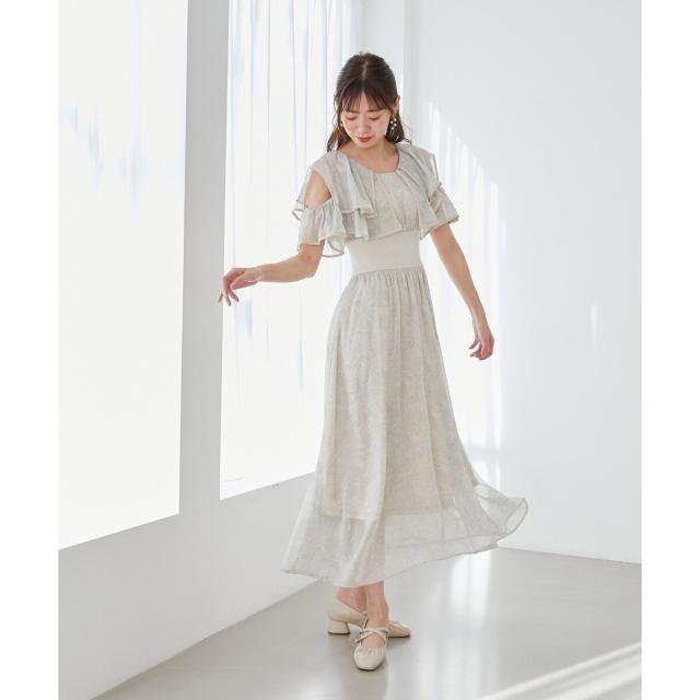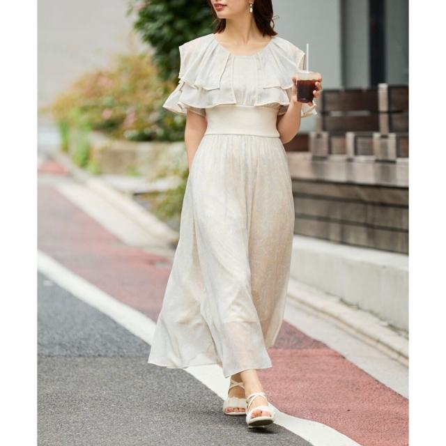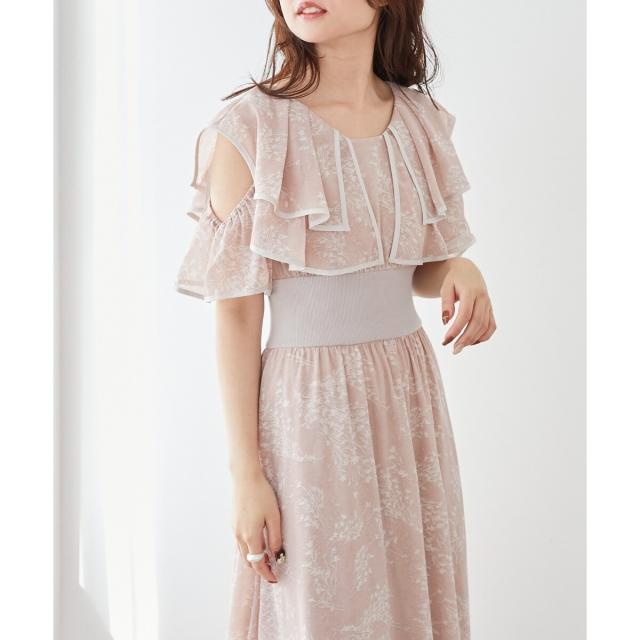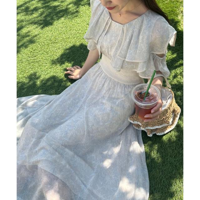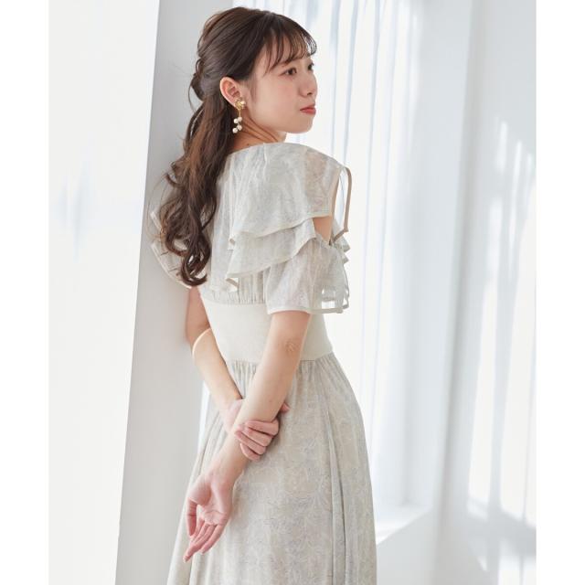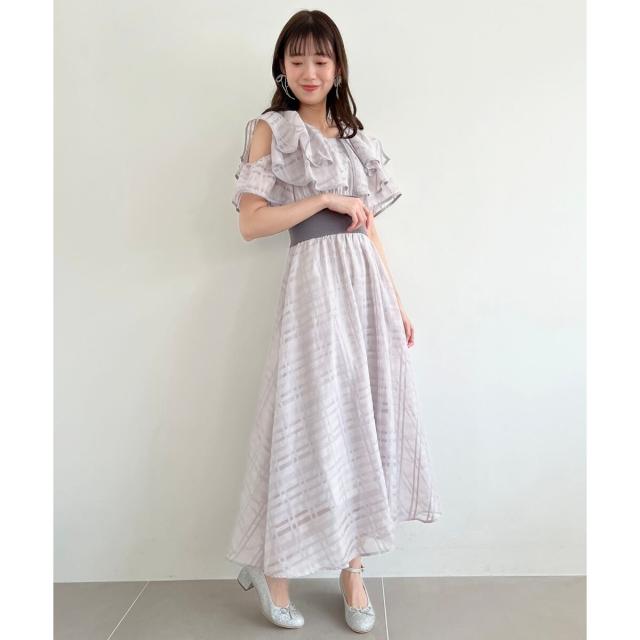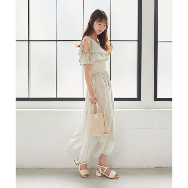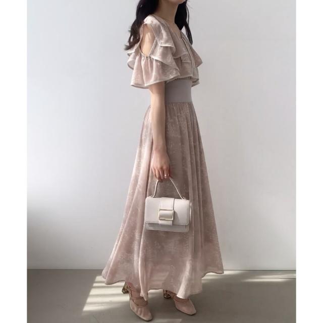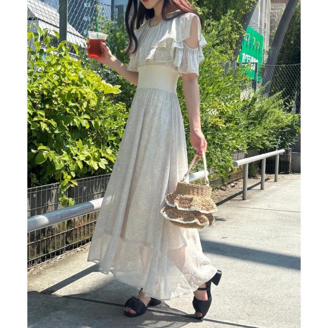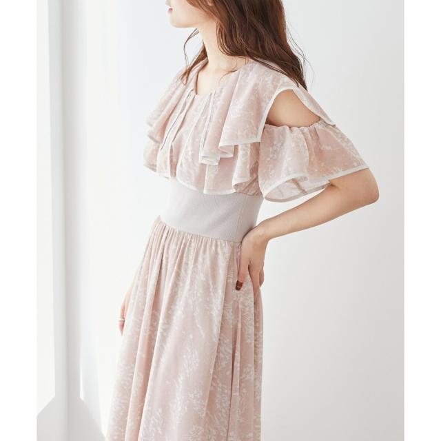 大きなフリルから覗くデコルテラインと肩の肌みせが大人あざとさを演出。