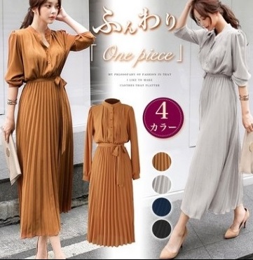 プリーツワンピース 細見え 春 お呼ばれ 普段使い お出かけ デート 黒 ブラウン グレー ネイビー 大きめ 無地 シフォン 大人 清楚 可愛い 上品 シンプル ゆったり Aライン 長袖 ミモレ丈 人気 トレンド 10代 20代 30代