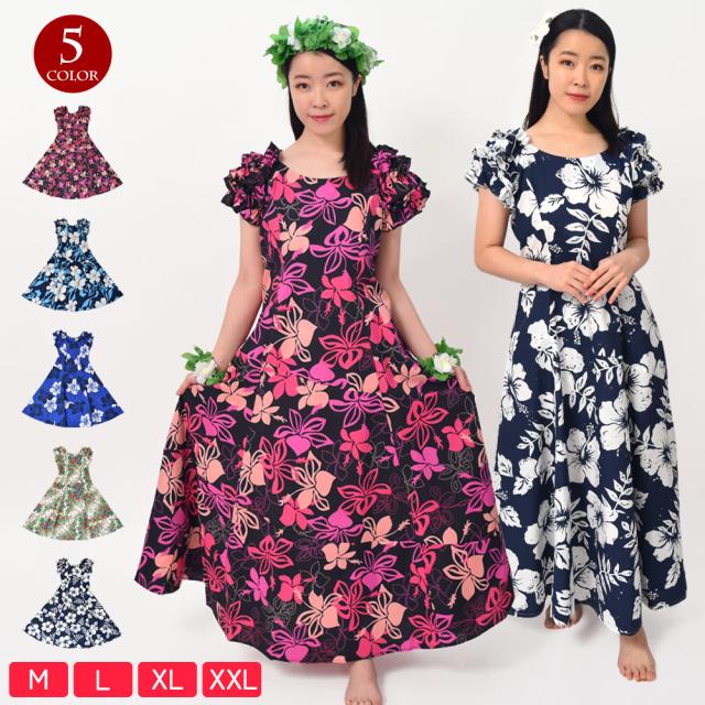 フラダンス衣装 フラダンス ドレス ハワイアンドレス ワンピース フラドレス R32G07[新品] リゾートドレス フラダンス ロングドレス花柄 衣装 イベント 発表会 袖フリル ロング丈 半袖袖 ファスナー 全5柄 ブラック ホワイト ブルー