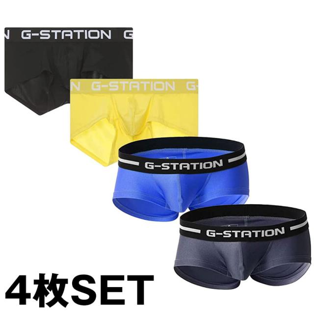 【4枚セット】G-Station/ジーステーション 水着系生地使用 ぴっちりフィット マキシマム3D立体ポーチ メンズボクサーパンツ 男性下着 メンズ メンズボクサー セクシー ローライズ ストレッチ ピチピチ スベスベ 光沢 タグレス