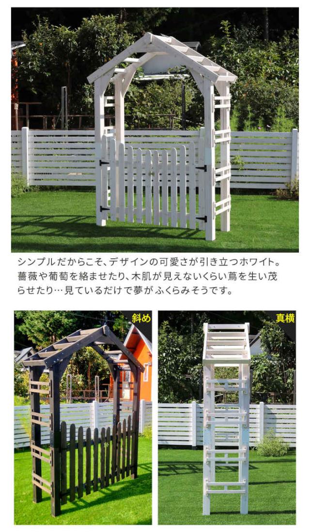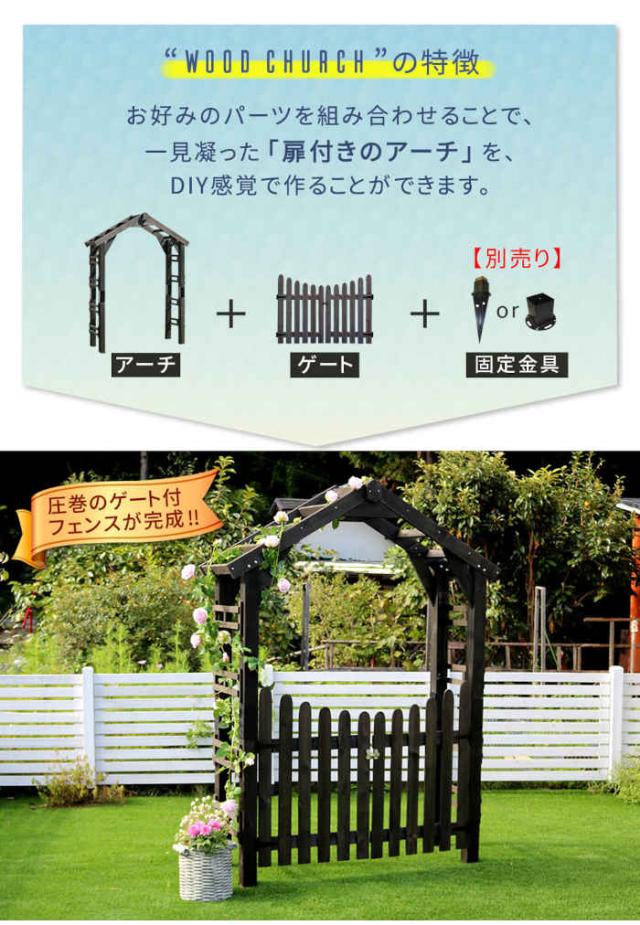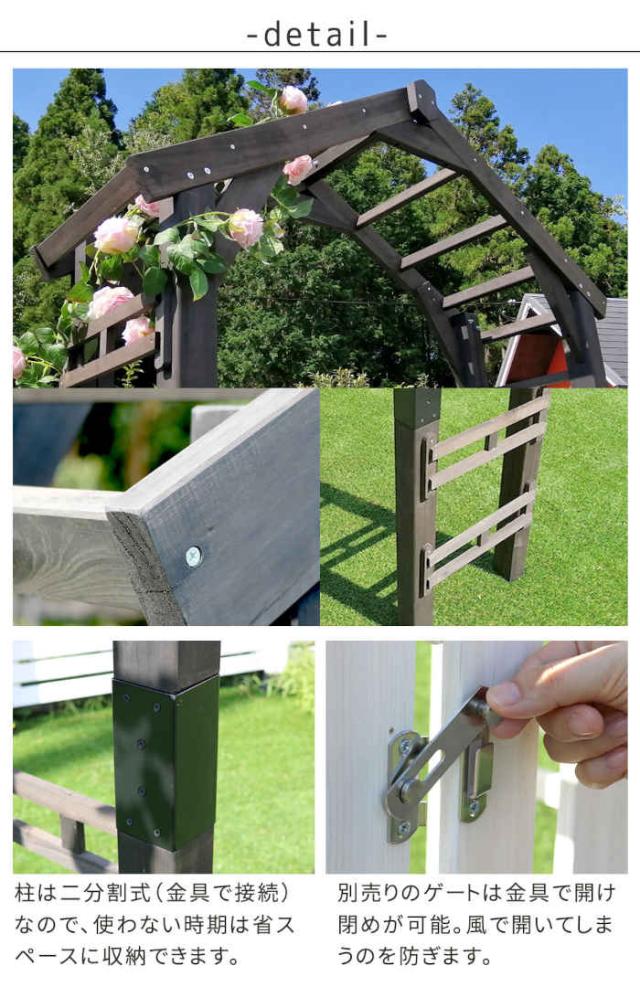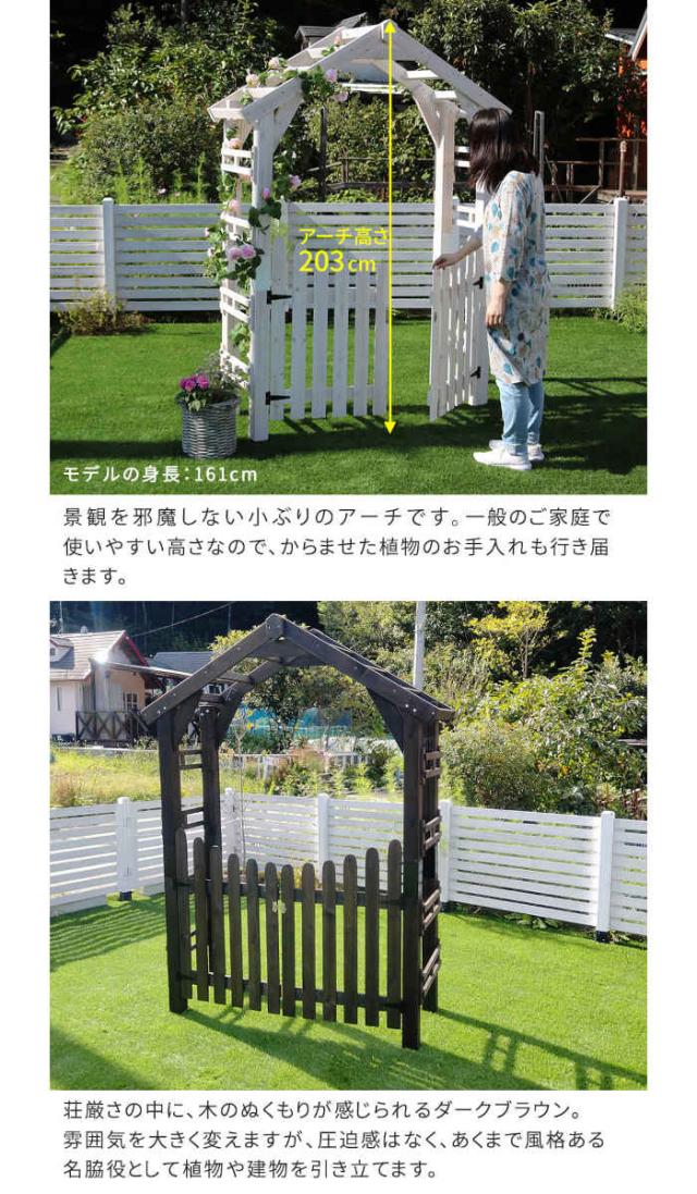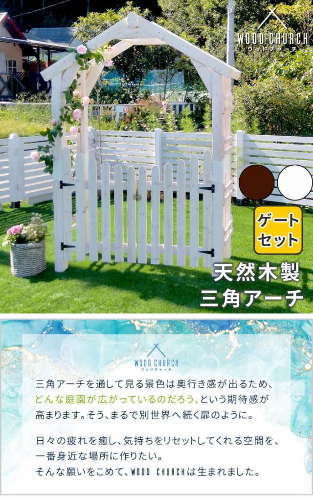 天然木製三角アーチ ゲートセット 「WOOD CHURCH」 (ウッドチャーチ) 。カラーは、ダークブラウン(4515085035688/TR-2100G-SET-DBR)、ホワイト(4515085035695/TR-2100G-SET-WHT)です。心洗われる、緑の中の三角アーチ。シンプルながら印象に残るお庭に。戸建ての入り口や、お庭の通路を華やかに彩る、おしゃれで使い勝手のいい三角アーチです。一からDIYするには難易度が高いアーチも、木材がそろったキットなら初心者でも簡単。美しい絵画のようなお庭が手に入ります。西洋建築を思わせる三角屋根が、立体感・奥行き感のあるお庭に見せてくれるフォーカルポイントに。家からの眺め変えてくれますよ。※アーチのみの単品販売です。フェンス、固定金具は含まれません。“Wood Church”(ウッドチャーチ)とは?三角アーチを通して見る景色は奥行き感が出るため、どんな庭園が広がっているのだろう、という期待感が高まります。そう、まるで別世界へ続く扉のように。日々の疲れを癒し、気持ちをリセットしてくれる空間を、一番身近な場所に作りたい。そんな願いをこめて、Wood Churchは生まれました。荘厳さの中に、木のぬくもりが感じられるダークブラウン。雰囲気を大きく変えますが、圧迫感はなく、あくまで風格ある名脇役として植物や建物を引き立てます。シンプルだからこそ、デザインの可愛さが引き立つホワイト。薔薇や葡萄を絡ませたり、木肌が見えないくらい蔦を生い茂らせたり・・・見ているだけで夢がふくらみそうです。