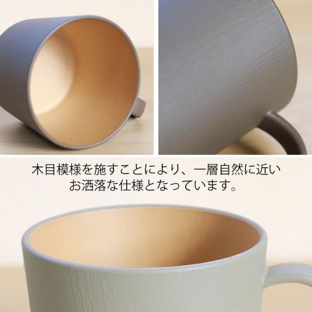 外側がグレー・ブラウン、内側をナチュラルな白木調に塗り分けることにより、自然色に近い色を楽しめるお洒落なマグカップ2個セットとなっています。