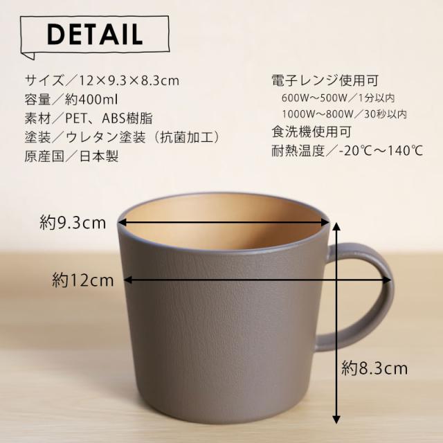 陶器やガラスと違い、軽く割れにくいので、キャンプなどのアウトドアにも最適です。ペアマグカップ 2個セット 400ml アースカラー 食洗機対応 電子レンジ対応 おしゃれ かわいい 北欧 コップ 抗菌加工 軽い 軽量 食器 割れにくい カフェ シンプル ナチュラル 木目調 箱入り ギフト ペア くすみカラー 日本製 山中漆器