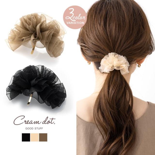 【ゆうパケットOK】ポニーフック ヘアフック ヘアカフス ヘアゴム 大人っぽい おしゃれ ヘアアクセサリー 髪留め まとめ髪 オーガンジー フリル 調節可能 曲がる ワイヤー 透け感 大人 ベージュ ナチュラル ブラック 黒