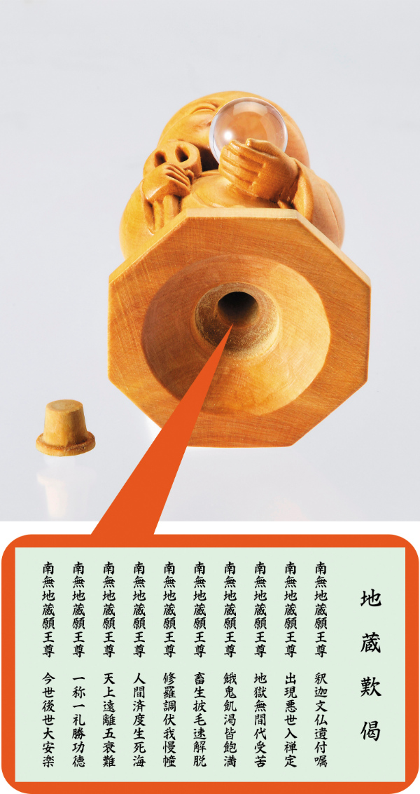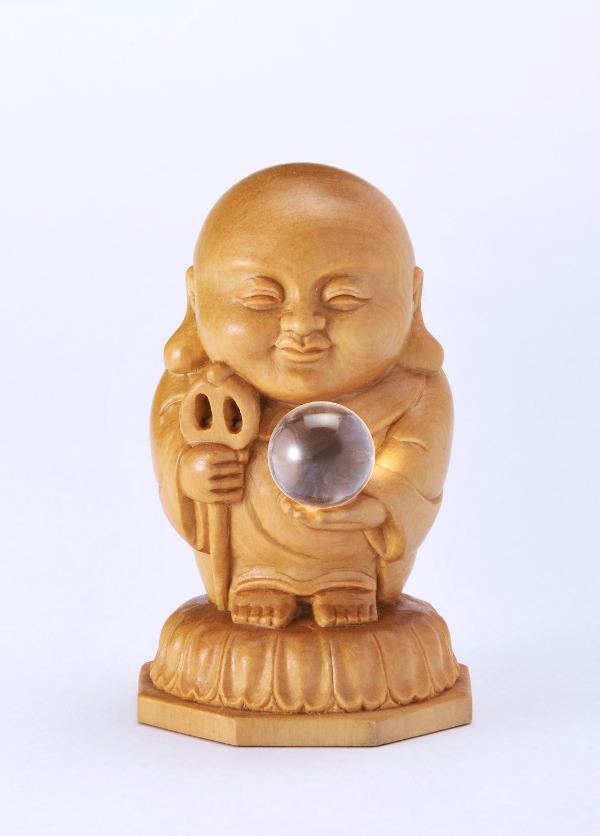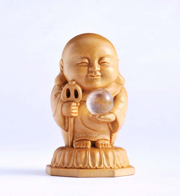 道端などに佇み、優しくそっと見守ってくれている「わらべ地蔵尊」は、衆生(すべての世・すべての者)の苦しみを自分のものとして受け止め、私たちの苦悩を幸福に変え、大きな慈愛をもってお答え下さるとても愛らしいお地蔵様です。左手に持つ水晶宝珠はあなたの不運を浄化し、大きな功徳、地蔵十福の授けを祈念します。作品は中国仏像彫刻界の重鎮で、人々から高い評価を受け活躍中の葉先生の作品。願うものに十もの福徳でお応え下さる慈愛に満ちたお地蔵様。願い事のある時、心に不安がある時、念を込めて「わらべ地蔵尊」をあたたかくそっと握りしめて下さい。お地蔵様の功徳を称える有難い経文「地蔵歎偈・じぞうたんげ」が胎内経として内包されておりますので、さらなるご利益が期待できます。